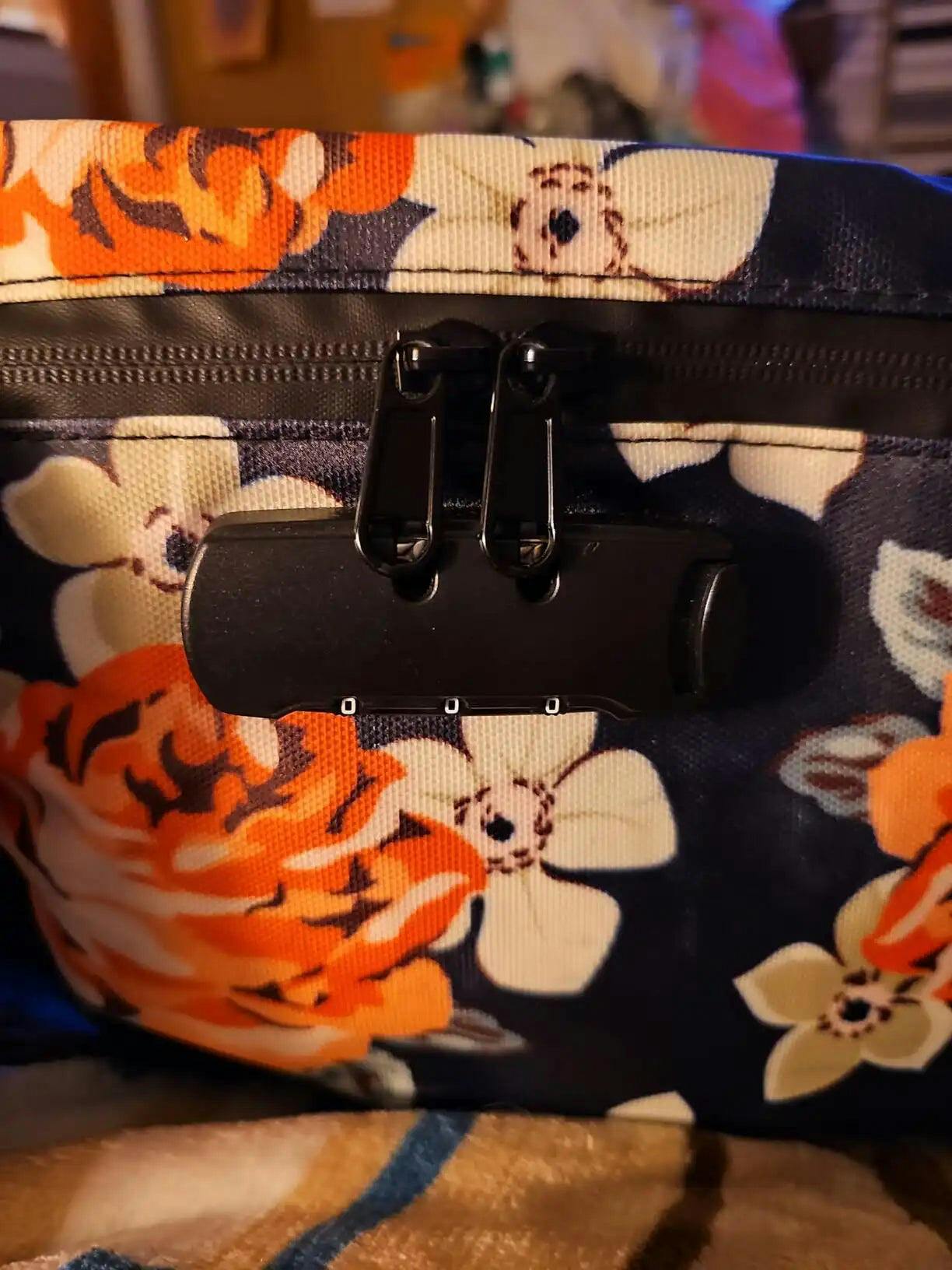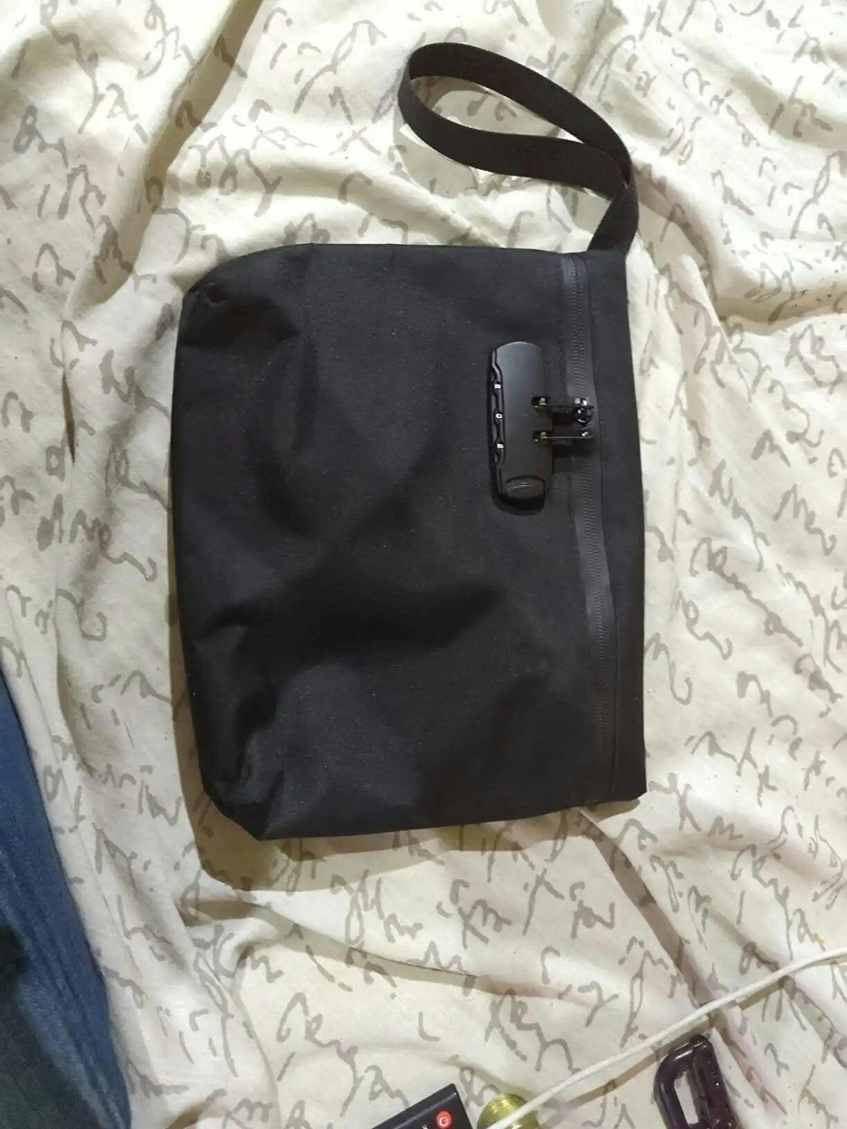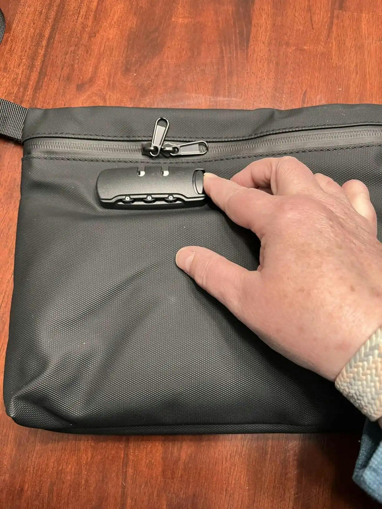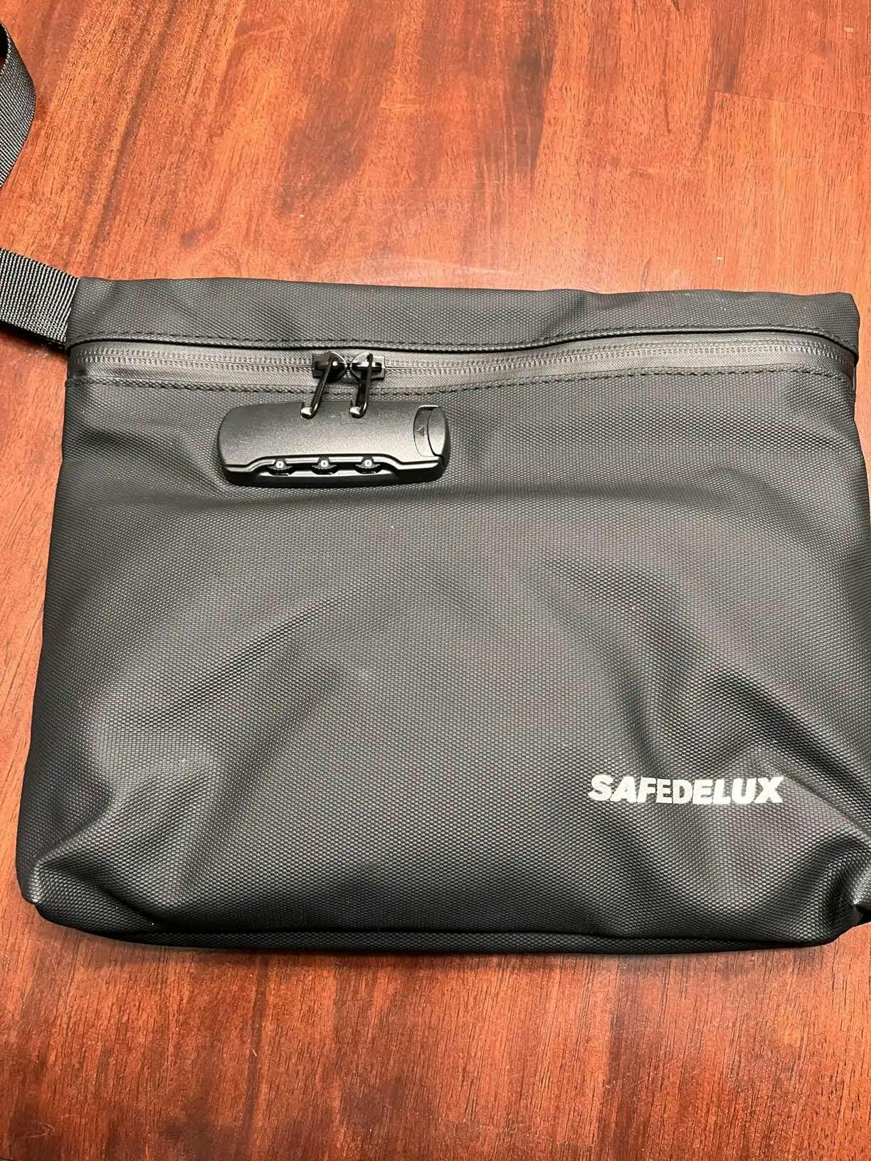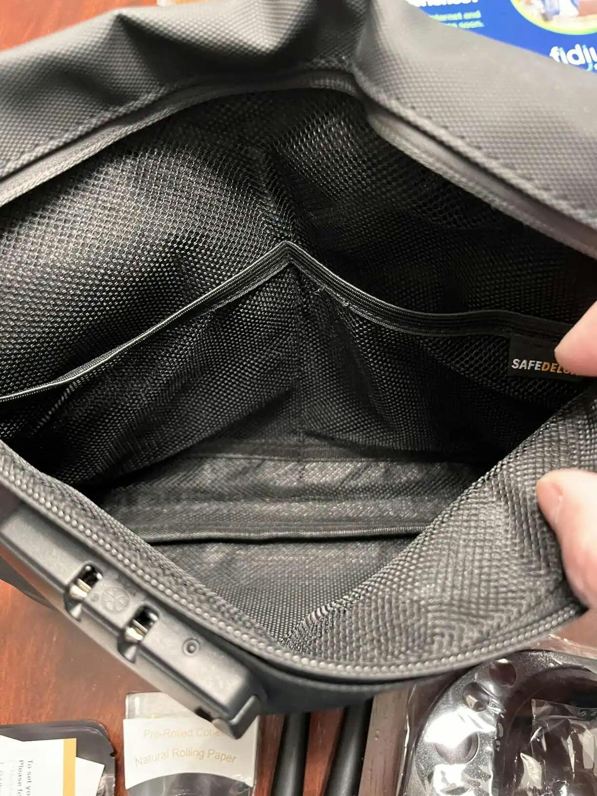 Great size and color. There doesn’t seem to be any smell coming through. Setting the code was easy as they gave you a card inside the bag with detailed directions on how to do it. There are 2 small pockets inside the big pocket which is great for storing certain items. It is easy to get the zippers into the lock so it cannot be opened. It’s not a hard thing to do, it’s just the only problem I have with the bag and I can’t even consider it that problem. There is also Velcro inside to add to extra sent protection.