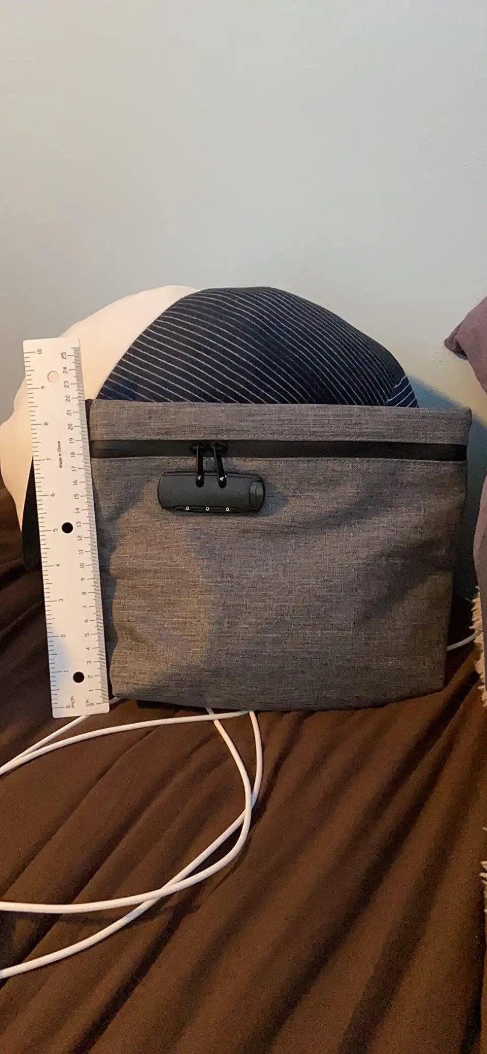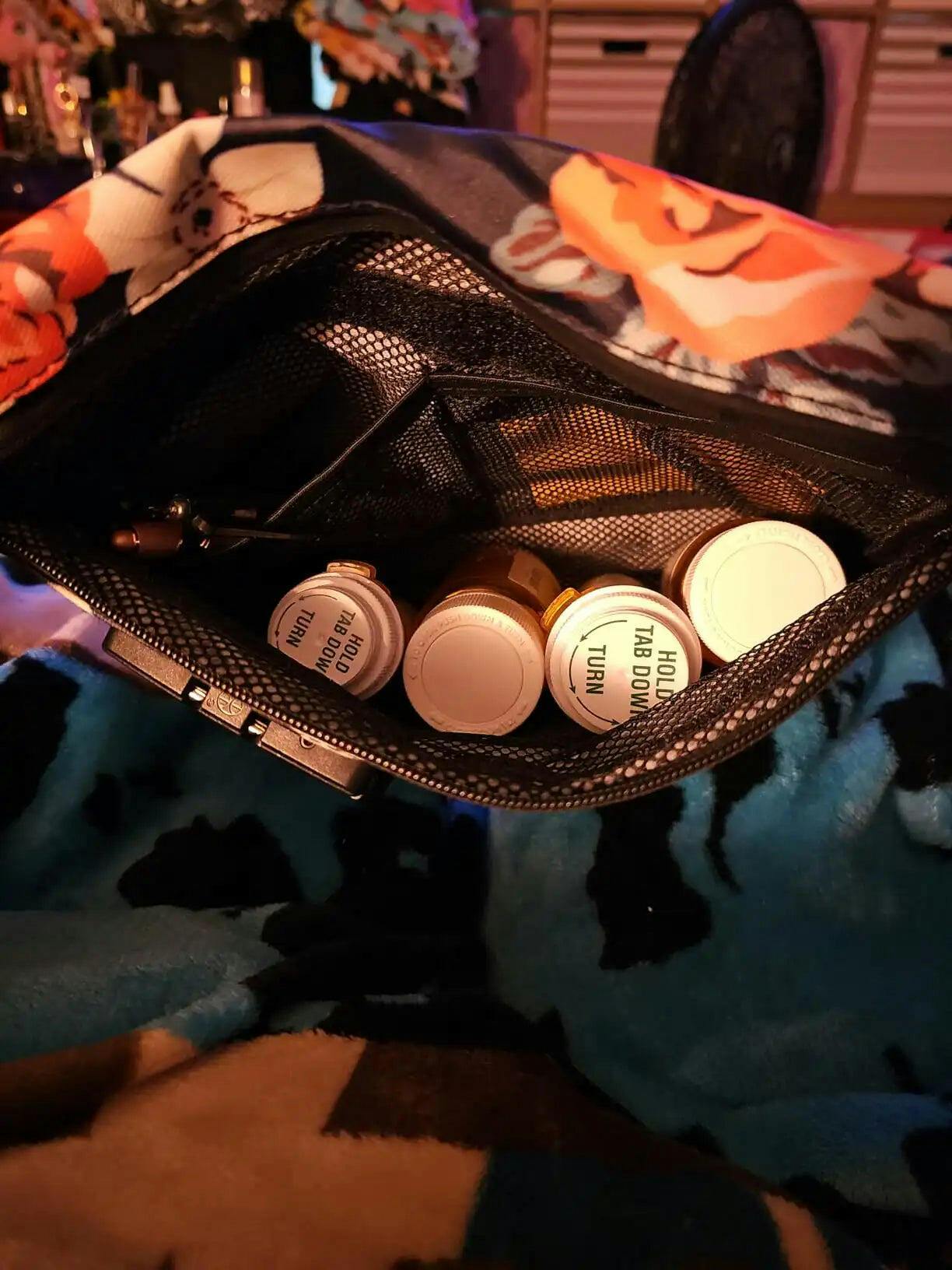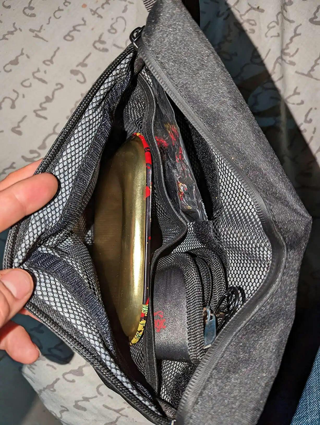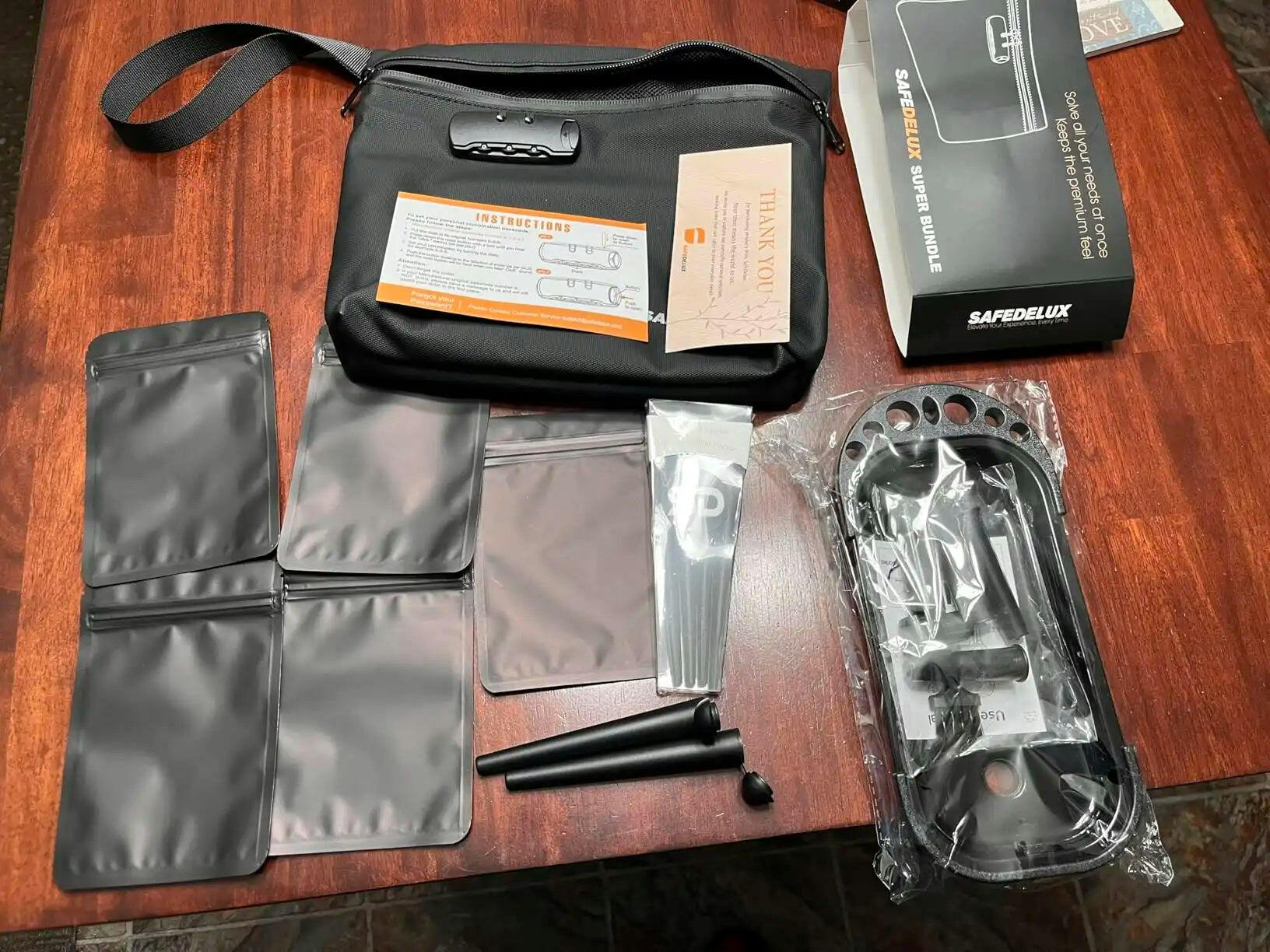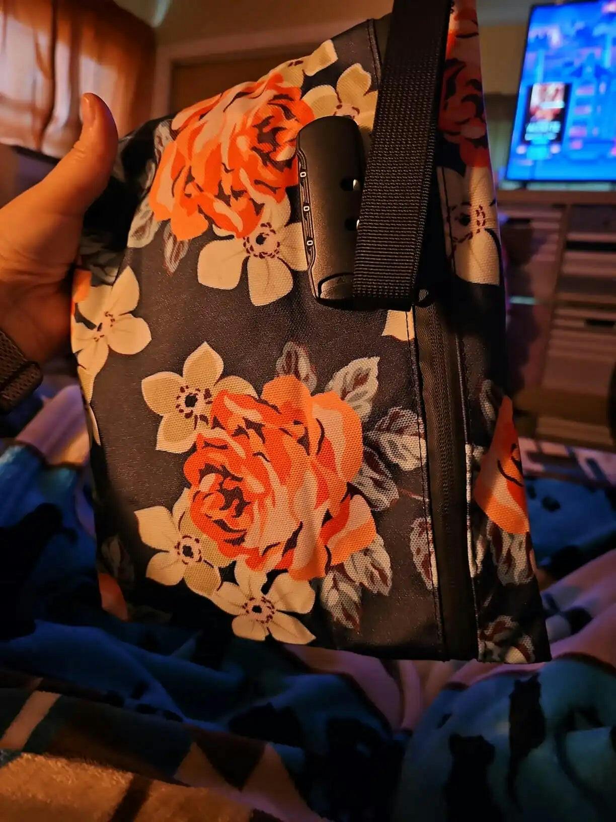 Great size and color. There doesn’t seem to be any smell coming through. Setting the code was easy as they gave you a card inside the bag with detailed directions on how to do it. There are 2 small pockets inside the big pocket which is great for storing certain items. It is easy to get the zippers into the lock so it cannot be opened. It’s not a hard thing to do, it’s just the only problem I have with the bag and I can’t even consider it that problem. There is also Velcro inside to add to extra sent protection.