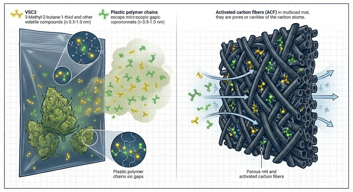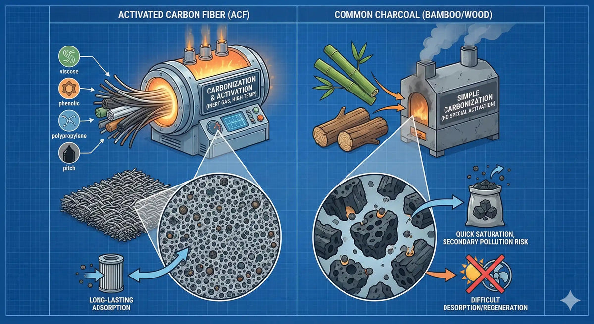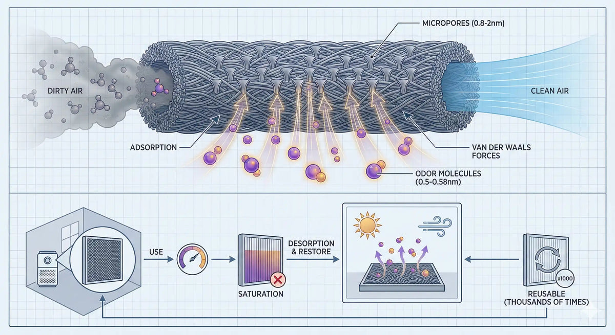 OZCHIN's odor control bags feature a special activated carbon formula of 200g/m², which maximizes odor capture through high-capacity physical adsorption that imitators simply can't match. Activated Carbon Fiber, abbreviated as ACF below, is the third generation of novel porous adsorption materials developed after granular activated carbon. It features a large specific surface area, abundant micropores, and strong adsorption and desorption capabilities. It is hailed as one of the most advanced environmentally friendly materials of the 21st century and is known as "black gold."